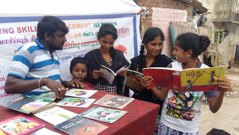 Reading class is an activity primarily conducted for / with children from standard 3 rd to 8th continuing their education in Government corporation schools, by a Book Fairy. The Book Fairy is a community level person specially trained and appointed to develop the reading skills of the municipal corporation/Adi-Dravidar schools children during the school hours within the school premise mobilizing the participation of school teachers and authorities.